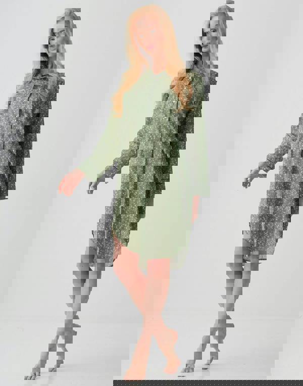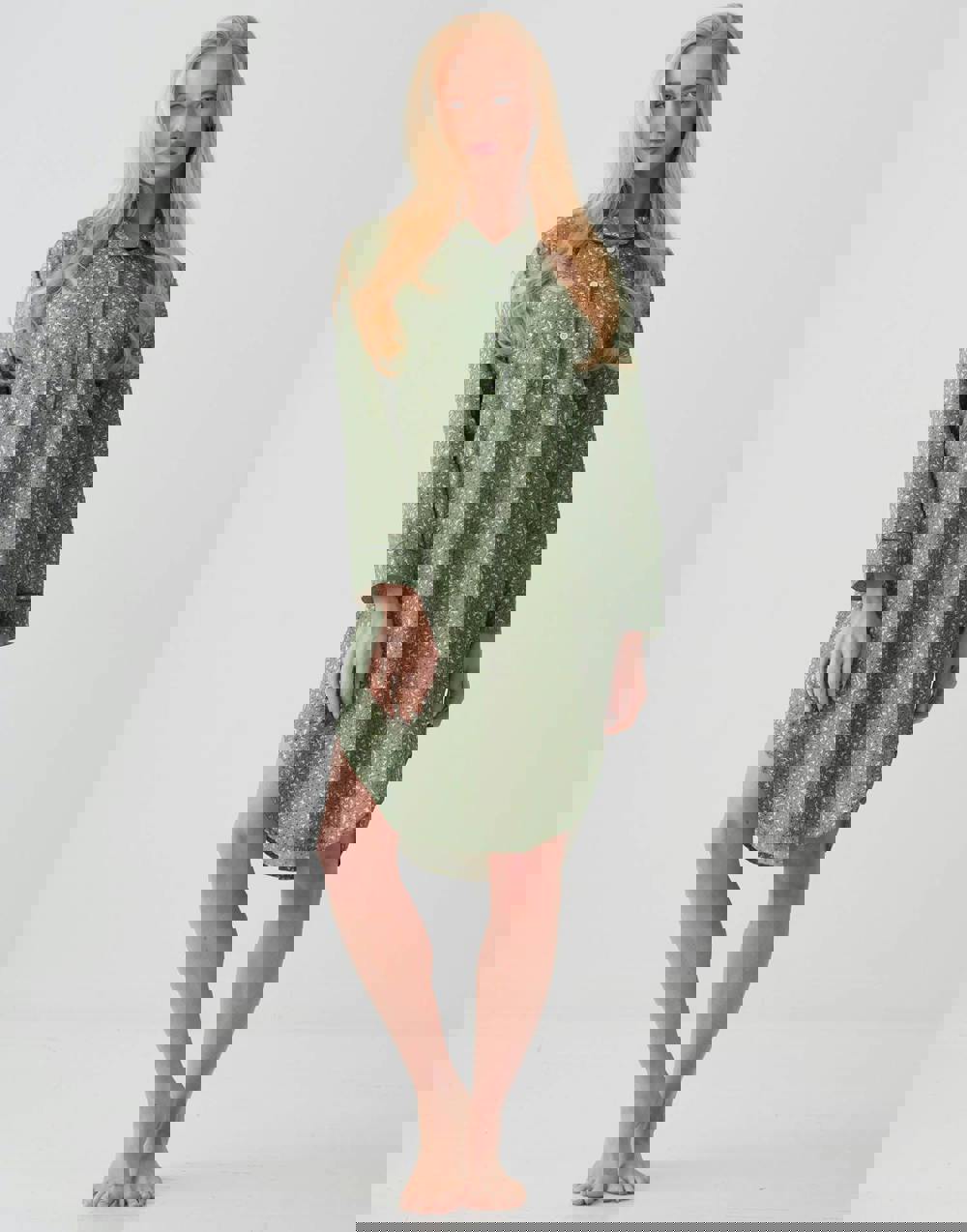 A four-button front adds a classic shirt-style detail, while the longer length suits relaxed evenings and comfortable sleep. Part of the Shrub Sage Flower collection, it is also available alongside a matching pyjama set and a strappy nightdress.