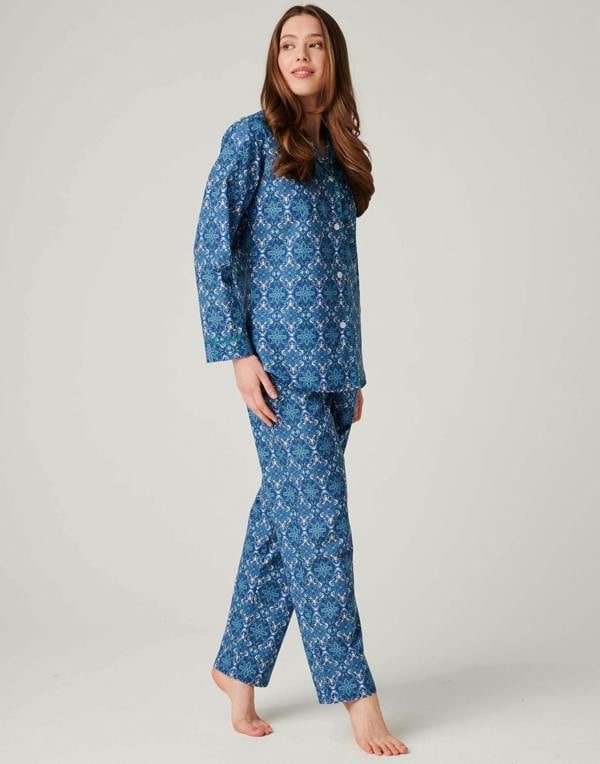 Cut from crisp, lightweight cotton, the British Boxers Marrakesh Paisley pyjama set brings a considered finish to women’s loungewear. The set pairs a traditional rounded-collar jacket with tie-waist trousers, offering a classic silhouette for relaxed evenings and unhurried mornings.
