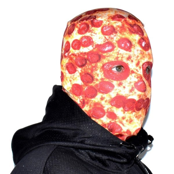 The Faceskin covers your entire head and face with a sewn-in top, turning you into a walking, talking, disturbingly lifelike slice of pepperoni pizza. Add props like a chef’s hat, apron, or even a pizza box for extra flavour.