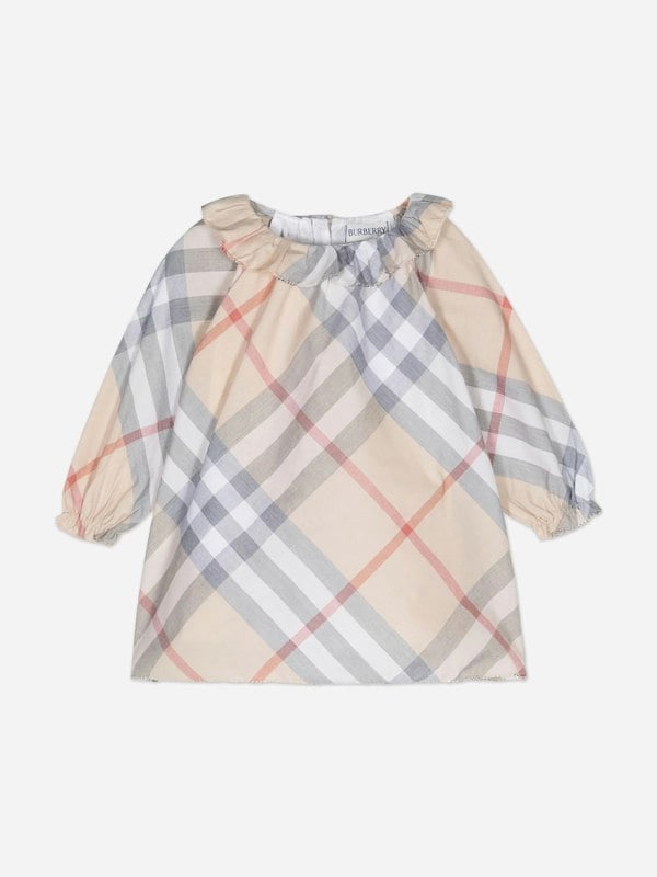 This Burberry Kids dress set comes in pale stone with the brand’s check pattern. Made in 100% organic cotton, the dress has long sleeves, a ruffle collar and elasticated cuffs, finished with a keyhole detail and a straight hem. A cotton lining adds an extra layer to the dress.