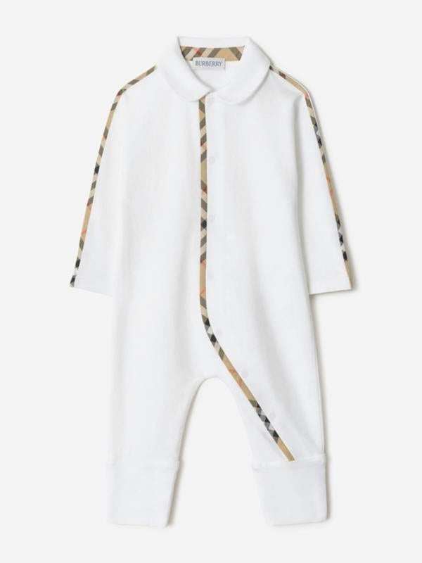 Iconic Burberry check detailing adds a recognisable touch, with check-patterned trims in beige, black, white and crimson. An asymmetrical front fastening and contoured collar complete the sleepsuit with clean, considered lines.
