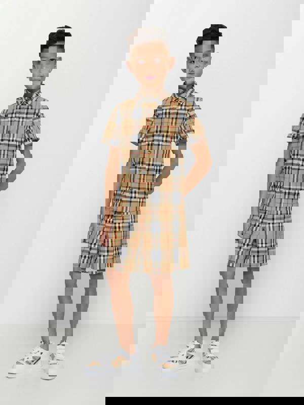 Burberry Kids Owen short sleeve shirt in beige with a sand check pattern. Made from 100% cotton, it has a classic collar and a button-up front for a clean, structured finish. A patch pocket sits on the chest, and the curved hem completes the silhouette.