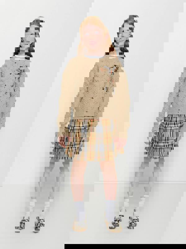 This girls Gabrielle skirt from Burberry Kids comes in beige with the brand’s Vintage Check. It is made from 100% cotton and finished with a pleated hem. Daniel Lee reconceptualises the House of Burberry into fascinating portraits.