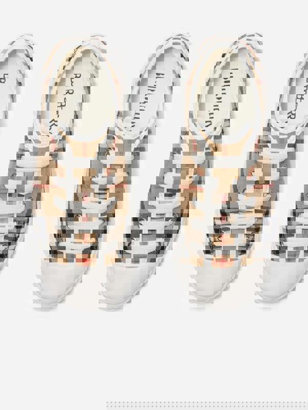 Burberry Kids Teddy trainers in beige with a check pattern. A low-profile shape and rounded toe create a streamlined silhouette, finished with white synthetic or rubber accents across the laces and toe caps. The upper is made from 100% fabric, paired with a 100% rubber sole.