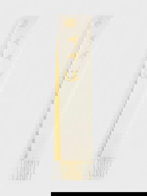 Cream white, Alpaca Wool blend (50% Alpaca Wool, 28% Wool, 22% Polyamide), Brushed effect, knit logo, reversible, frayed edges.