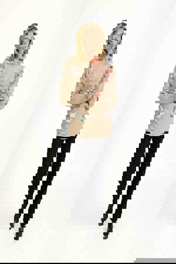 Add a touch of sparkle to your wardrobe this season with our Butterfly Diamanté Embellished Batwing Jumper. This cosy knit features silver and gold coloured sequinned butterflies on a classic-coloured background finished with a round neck and a stylish curved hem.