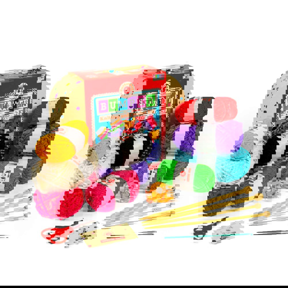 Buttonbag's BUMPER suitcase has everything you need to learn to knit and crochet and complete lots and lots of fantastic projects! In fact, this kit combines everything in our Learn to Knit, Learn to Crochet and PomPom Scarf kits in one very big, very full Bumper suitcase. We've included full colour instructions which teach all the basic techniques and our very easy patterns are perfect for beginners.