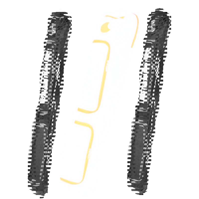 Byte's TX stickbag is the ideal stickbag for junior and club hockey players. Features include a single shoulder strap with padded breathable mesh for added comfort, mesh side pocket for water bottle or shinguards, a re-enforced bottom, two large front pockets and small top pocket. The stick capacity is four sticks. The material is 600D polyester.