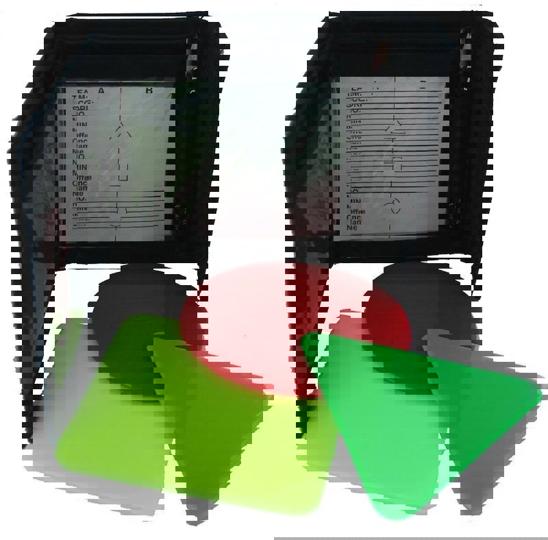 Hockey umpire wallet including red, yellow and green cards. Velcro closure, includes note pad and pencil.