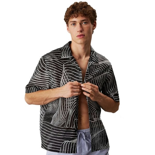 Indulge in the luxurious allure of the Calvin Klein All Over Printed Beach Shirt Palm Leaves Aop. Crafted from lightweight, breathable fabric and adorned with an all-over print, this design exudes elegance. Boasting a classic collar with a sleek button fastening, it features the iconic Calvin Klein logo tab at the side seam for a touch of exclusivity.