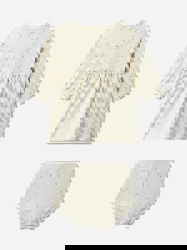 This Calvin Klein baby girls dress comes in an ivory colourway with an all-over print. CK branding adds a recognisable designer finish, keeping the look consistent with the label’s signature style.