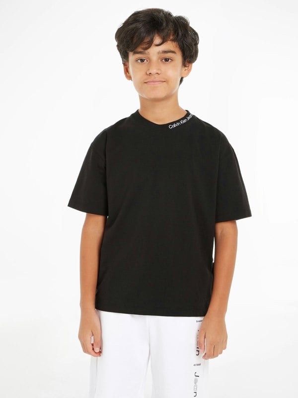 This boys relaxed T-shirt from Calvin Klein Jeans comes in black with an intarsia pattern for a clean, contemporary look. A neck embroidered detail adds a branded finish, keeping the design simple and recognisable for everyday wear.