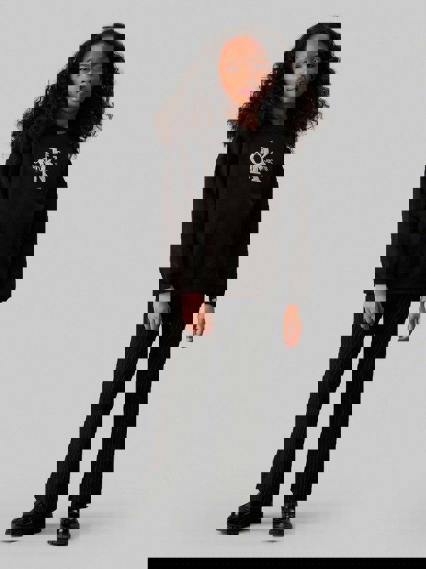 Calvin Klein Jeans girls pinstripe flare trousers in black for AW2024. The pinstripe pattern brings a clean, tailored look, while the flared leg creates a distinct silhouette with a retro note. A versatile option for updating everyday outfits with a more polished finish.