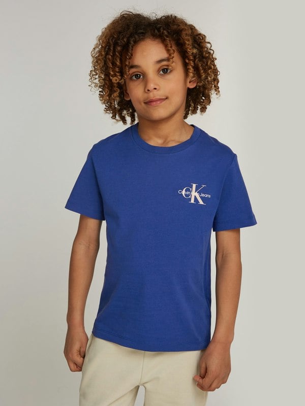 Calvin Klein Kids Chest Monogram T-Shirt in blue. The front has a CK monogram across the chest. A nonseasonal style for everyday wear.