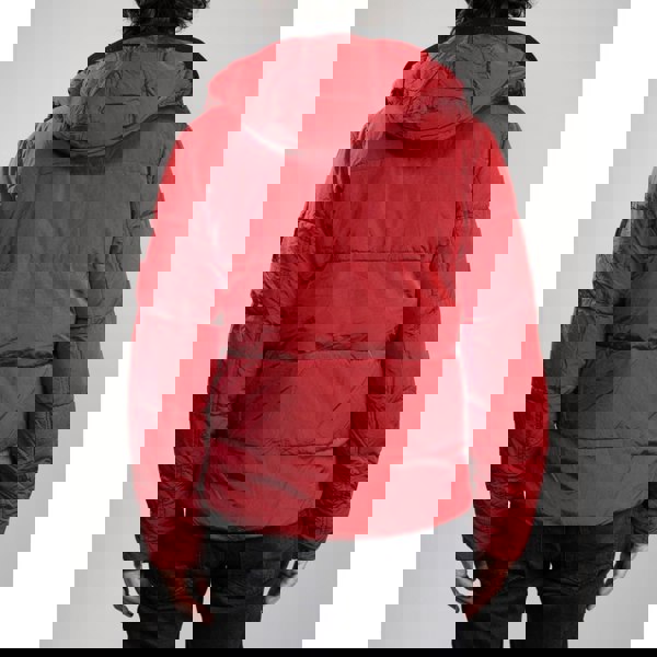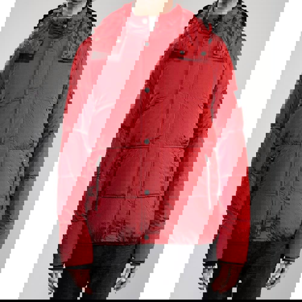 Semi-shiny crinkle nylon, black trims and logo elastic modernise this mid-length puffer jacket.