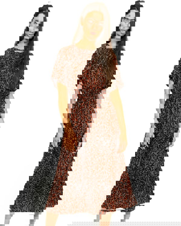 Discover designer women's dresses with Calvin Klein's Short Sleeved Printed Midi Dress in Leopard - Brown