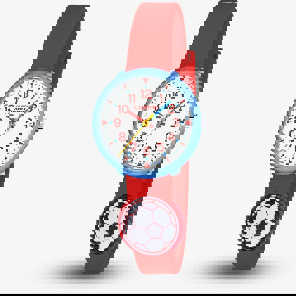 The Calypso "My First Watch" is the perfect starter timepiece for young boys, featuring a fun football-themed design with a durable light blue plastic case and a comfortable red rubber strap. Its colourful dial with large, easy-to-read Arabic numbers makes learning to tell time simple and enjoyable, making it an ideal choice for active kids and football fans alike.
