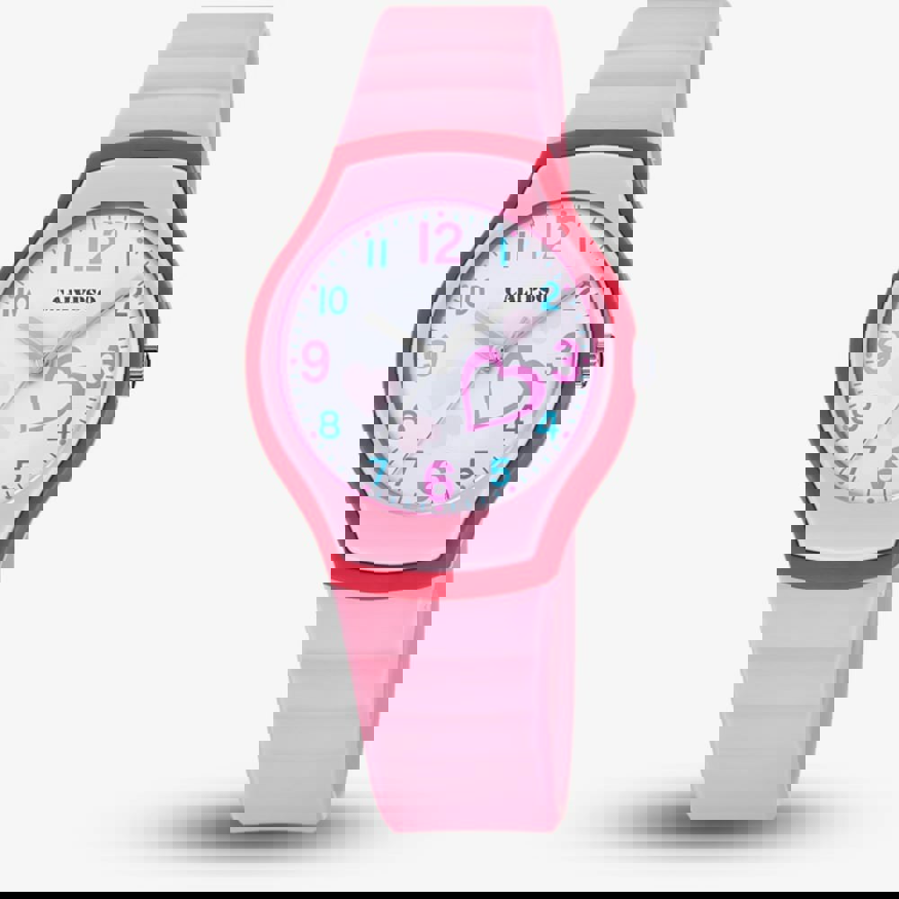 • Presented on a pink plastic strap with traditional buckle.