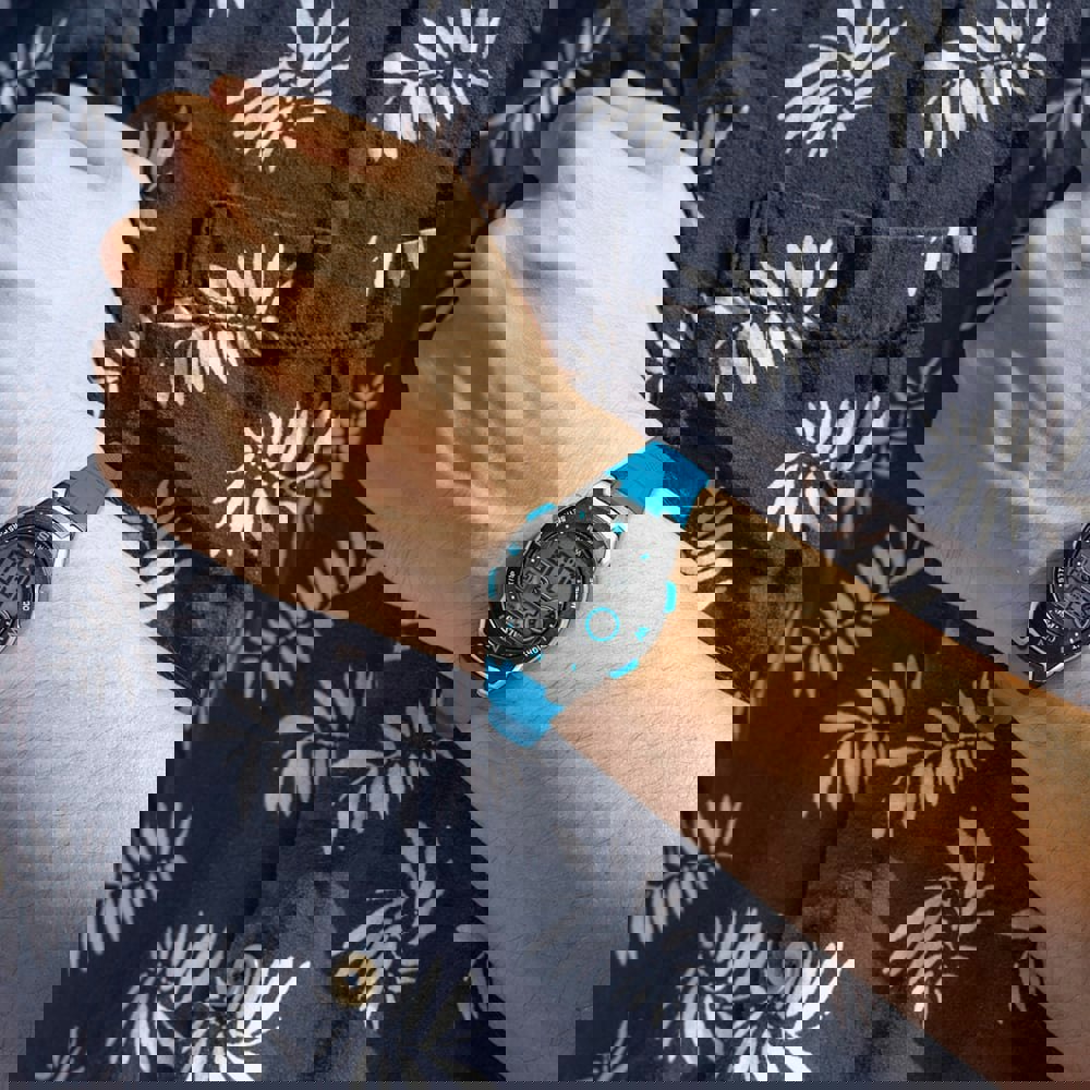 • Presented on a blue rubber strap with traditional buckle.