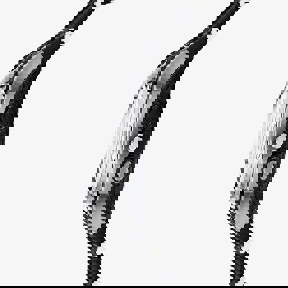 • Presented on a black rubber strap with traditional buckle.