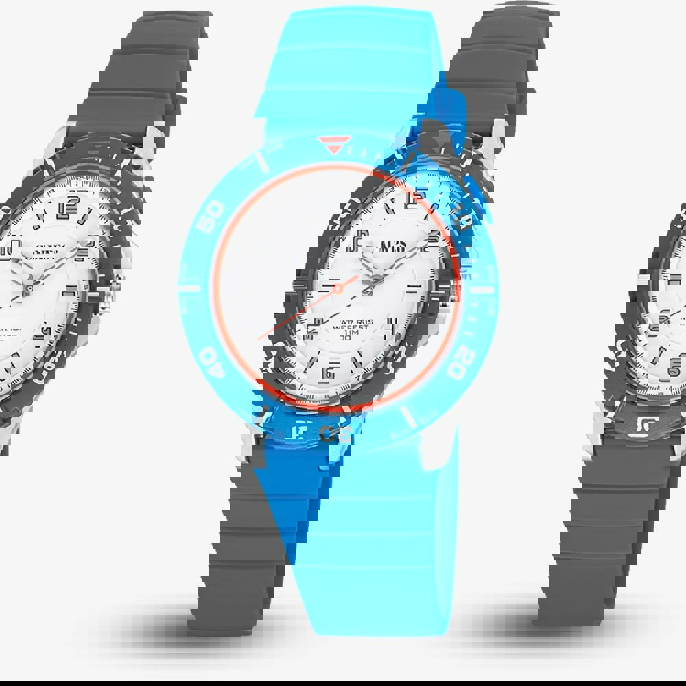 From the playful Sweet Time collection, the Calypso Men's Watch brings a fresh pop of colour with its bright blue rubber strap and matching blue bezel. The clean white dial features easy-to-read Arabic numerals and baton hour markers, complemented by luminous hands for visibility in low light. Fun, stylish, and easy to wear, it’s the perfect everyday watch with a bold twist.