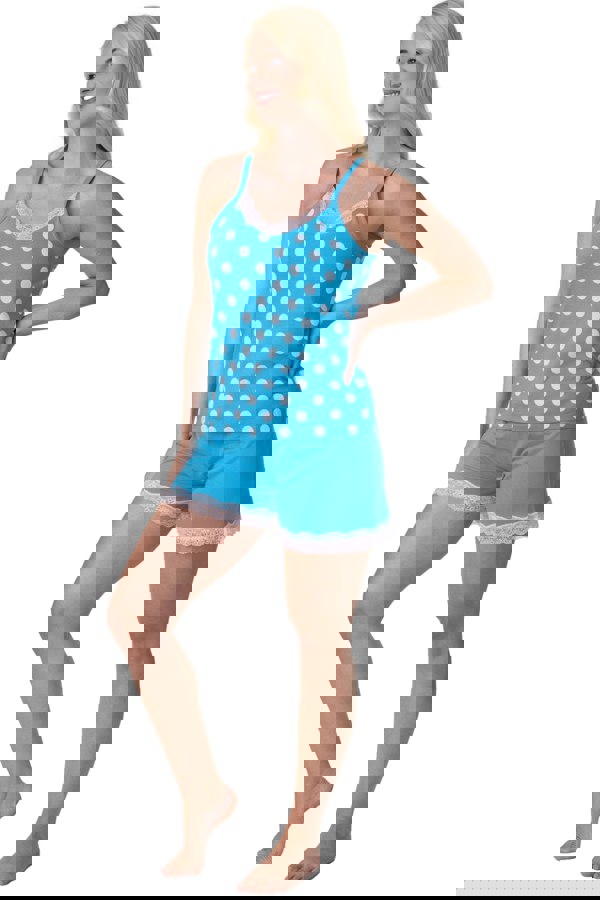 Camille Aqua Lightweight 100% Cotton Spot Printed Sleeveless Top Pyjama Set With Lace Detailing
