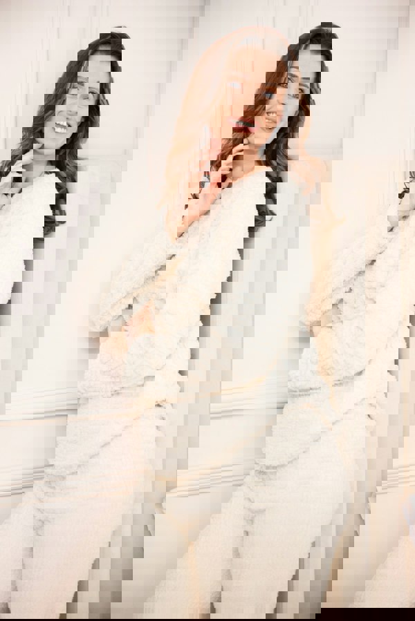 Camille Womens Cream Supersoft Fleece Textured Woven Pattern Pyjama Set