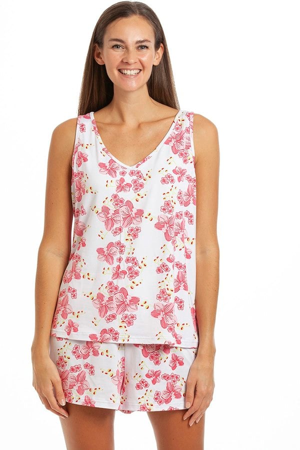 Our new short floral pyjama set is a great addition to your spring-summer wardrobe. Featuring a stylish floral print in three different colour, sleeveless top and an elasticated waist. This set is made from a polyester/spandex blend making this a loose fitting pyjama with added stretch if needed for extra comfort. This Pyjama is machine washable at 30° and washing dark colours separately.