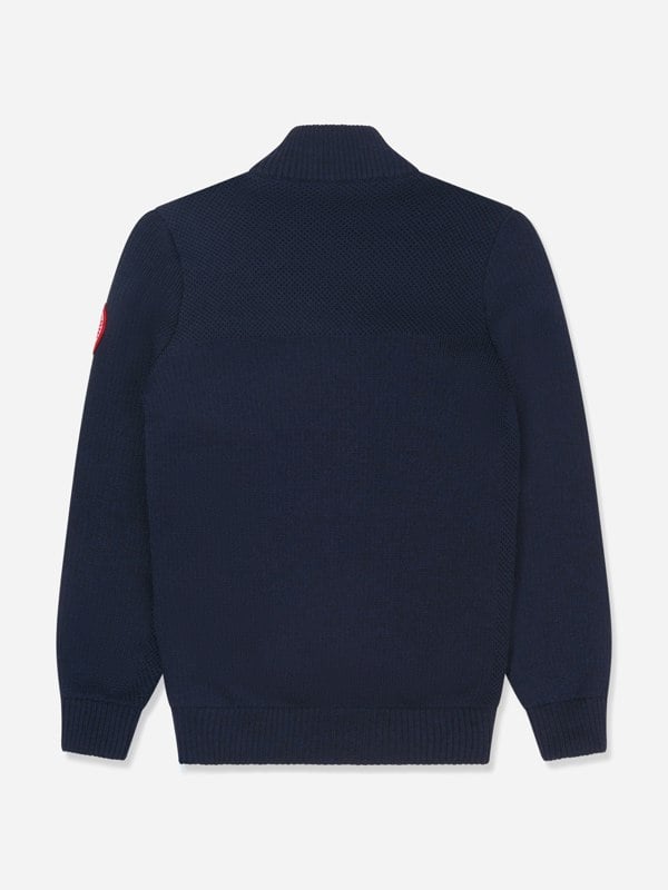 Canada Goose Kids Hybridge Knit Down Jacket in blue. This unisex jacket has a printed design and is presented as a back to school option.