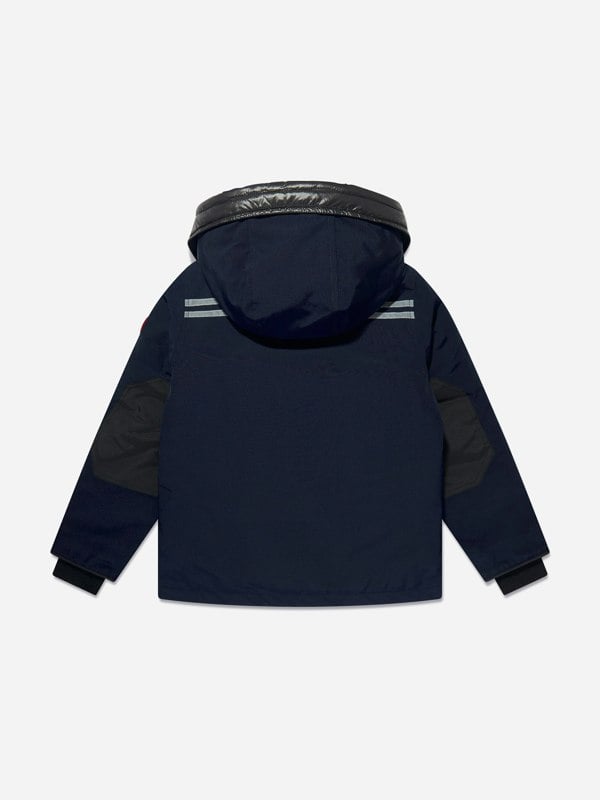The Canada Goose Kids Logan Parka in navy is a unisex parka for skiing. It comes in a navy blue colour and is presented as winter wear.