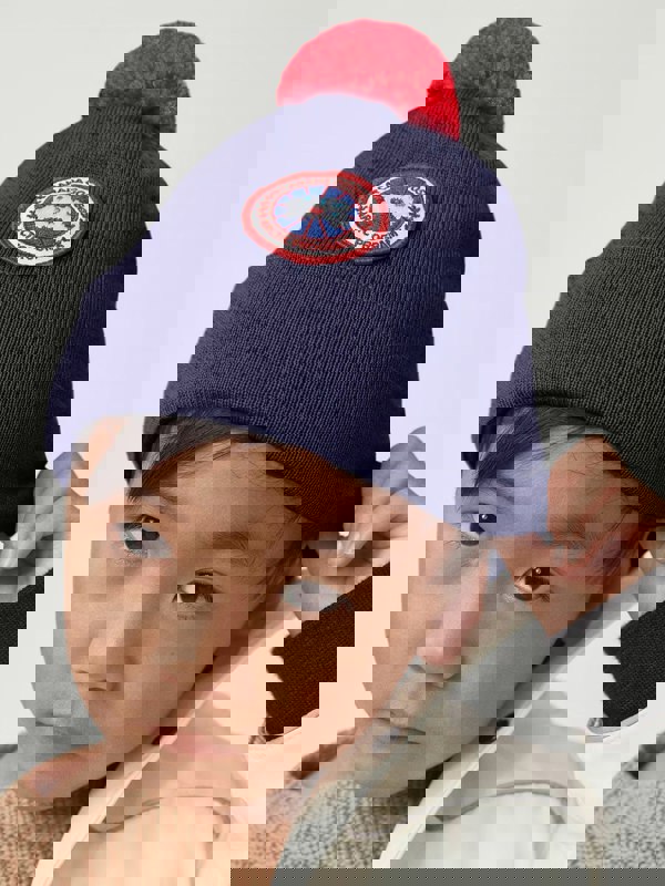 Canada Goose Kids Pom Toque Hat in navy adds a simple, practical finish to a child’s outfit. Made in Italy, it brings the brand’s recognised outerwear heritage into an everyday accessory. The deep navy colour keeps the look clean and easy to pair, while the pom detail gives a classic toque silhouette.