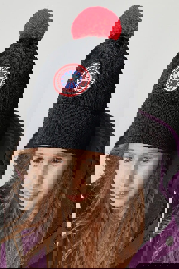 This Canada Goose kids’ pom pom hat comes in black with ribbed detailing and a turn-up brim. A logo patch sits on the front, finished with a red pompom detail. The material is 100% wool.