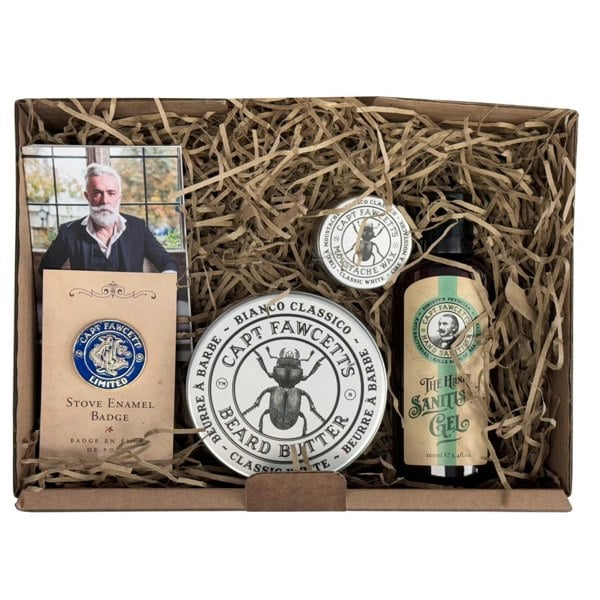 Gift Set contains a Bianco Classico Beard Butter 80ml, a Bianco Classico Moustache Wax 15ml, an Alessandro Manfredini Eau de Parfum 2ml, a The Handy Sanitiser gel 100ml, a Captain Fawcett's Stove Enamel Badge and a couple of cardboard coasters.