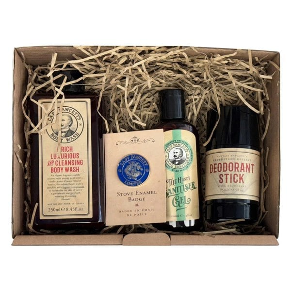 Set contains a Body Wash 250ml, a Deodorant Stick 75ml, The Handy Sanitiser gel 100ml, a Captain Fawcett's Stove Enamel Badge and a couple of cardboard coasters