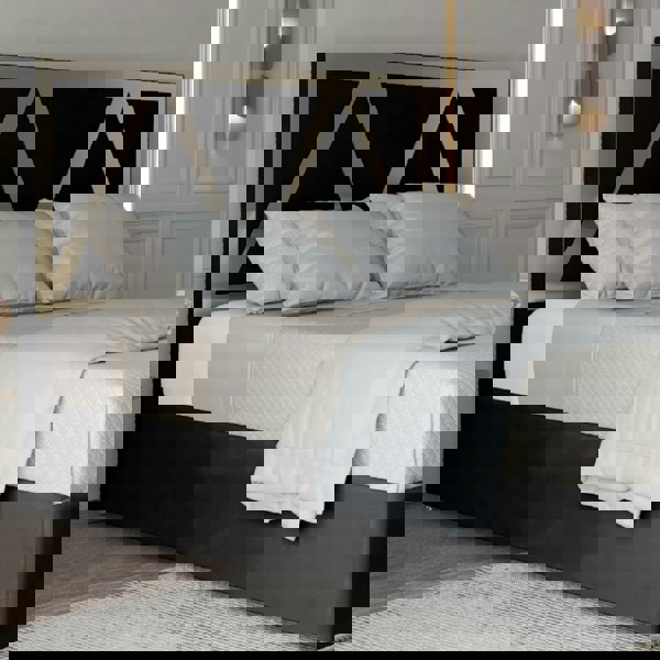 The headboard is panelled and boasts a generous lofty and comfy surface