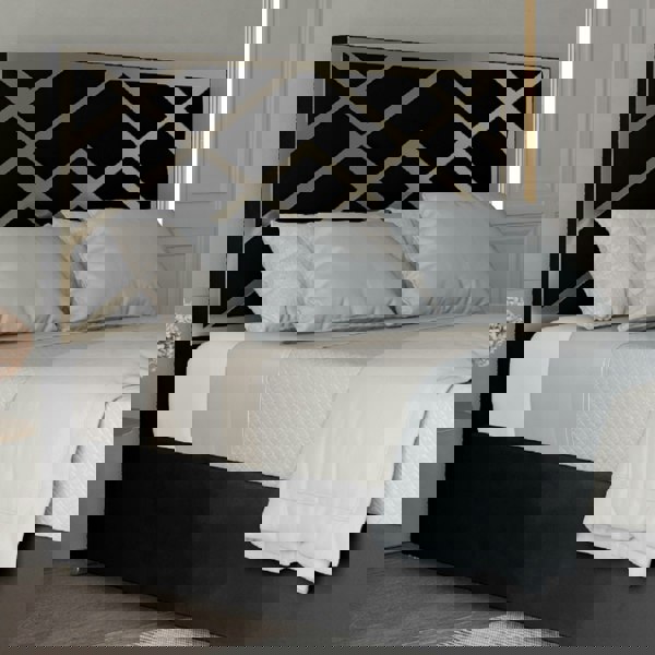 The footboard is detailed with pipe feet to match brushed silver or gold legs to match brushed gold