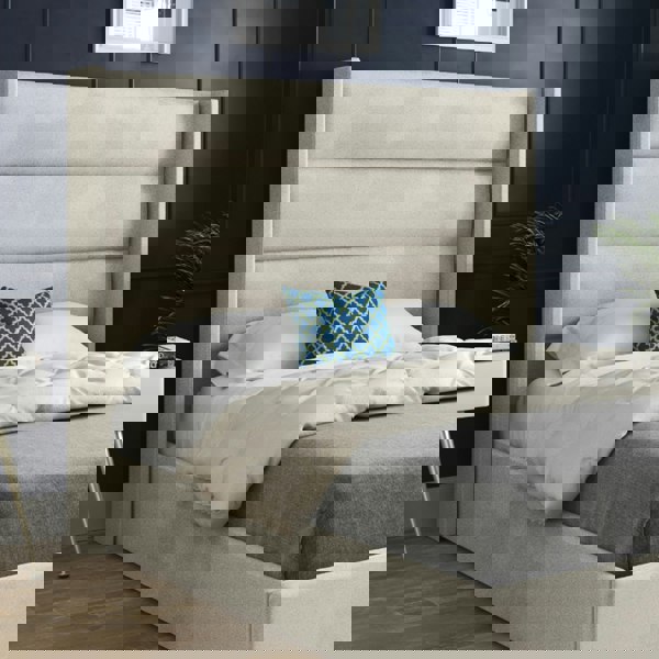 The Nuno bed frame features a tall headboard in a horizontal flute style with winged sides and upholstered surround and low footboard
