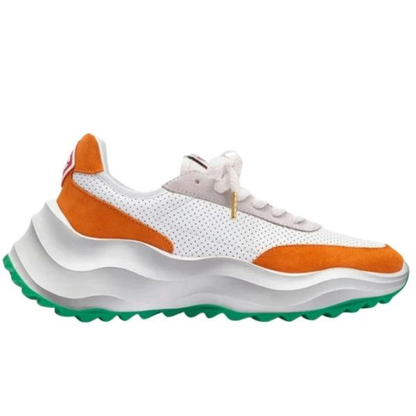 Casablanca Atlantis Sneaker Orange Detail White Shoes combines clean minimalist design with vibrant accent detailing. Crafted entirely from textile materials and made in Indonesia, these sneakers deliver comfort and breathability for everyday wear. The striking orange accents contrast beautifully against the crisp white base, creating a versatile silhouette that pairs effortlessly with casual and contemporary wardrobes. Perfect for those seeking quality construction with understated style.
