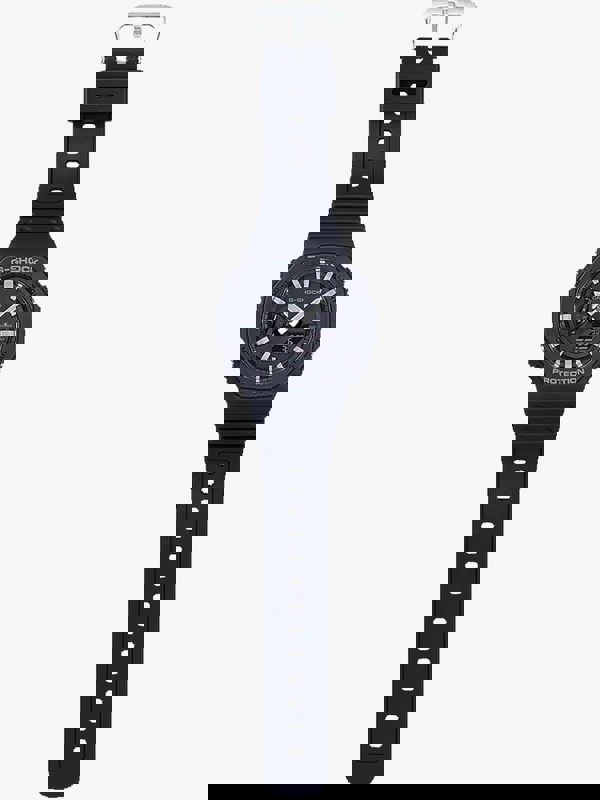A Casio G-Shock Classic Octagon Series watch composed of a carbon reinforced resin case and resin strap with a buckle clasp. This black watch has a black dial with luminescent hands and LCD digital displays, all of which are powered by a quartz movement. Mineral crystal also protects the dial and allows a 200 metre water resistance.