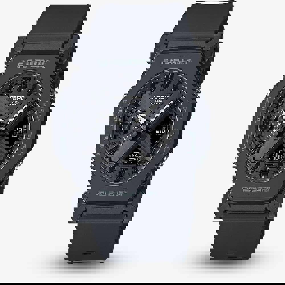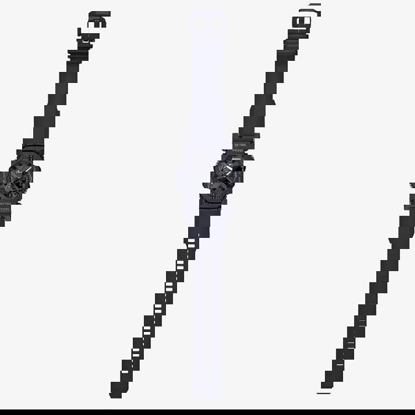 This black rubber resin strap watch for men features a black dial with a dual display, combining digital and analog timekeeping. It is shock-resistant and includes an LED light, making it both stylish and durable.