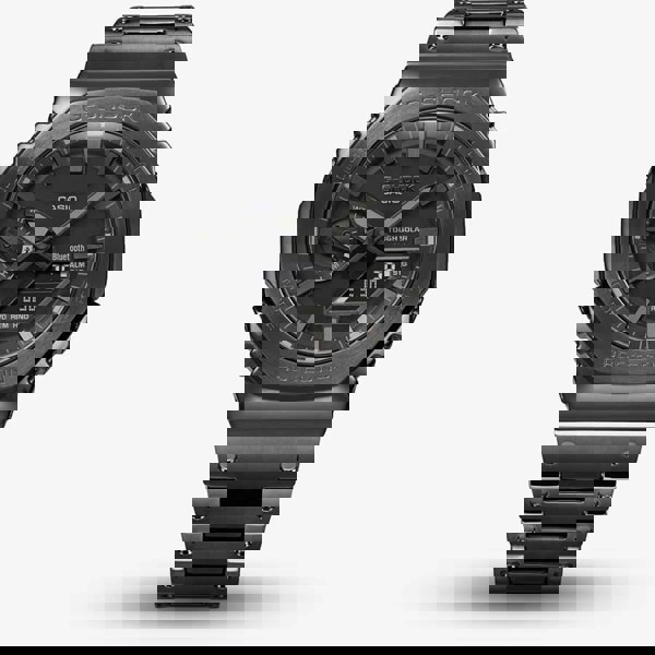 The Casio GM-B2100BD-1AER 0 smartwatch combines a round shaped stainless steel case and black stainless steel bracelet with a fold over clasp. It has a black dial which is protected beneath mineral crystal glass. Power is generated by the quartz movement. This model also has a water resistance of up to 200 metres.