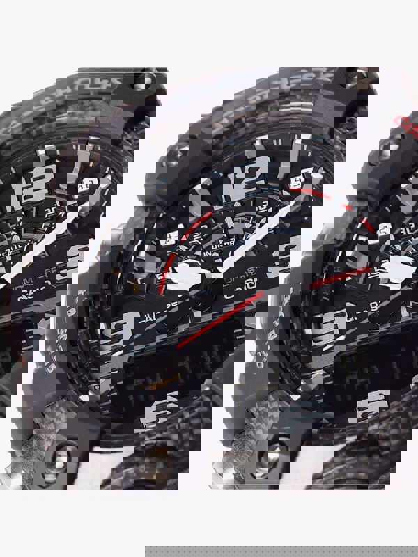 A Casio Mudmaster watch composed of a black carbon fibre reinforced case and black resin strap with a buckle clasp. This impressive watch is designed to endure an even higher level of toughness and withstand the harshest land environments. The new extreme shock resistant Carbon Core Guard structure integrates the case and back cover into a single carbon Monocoque unit to protect against severe impact. Strong, practical, and supplied with a vast array of functions, this watch is perfect for any scenario.