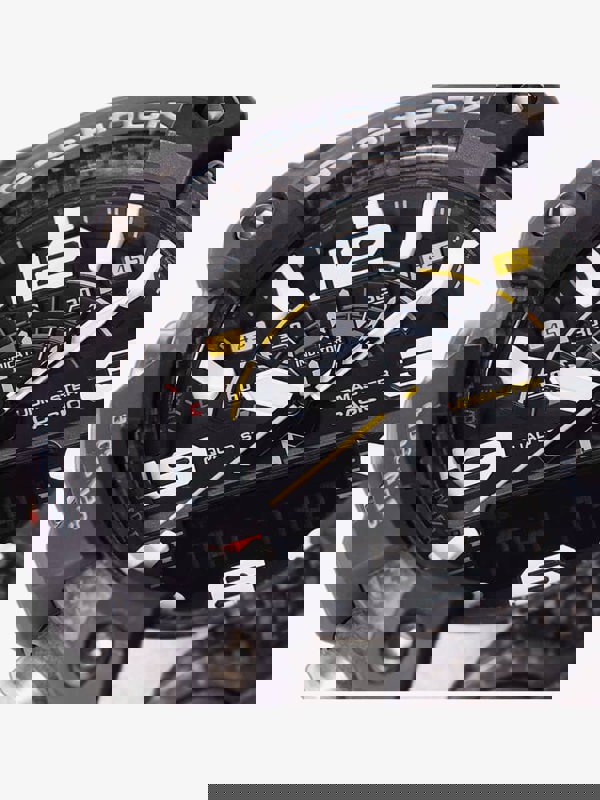 A Casio Mudmaster watch composed of a black carbon fibre reinforced case and green resin strap with a buckle clasp. This impressive watch is designed to endure an even higher level of toughness and withstand the harshest land environments. The new extreme shock resistant Carbon Core Guard structure integrates the case and back cover into a single carbon Monocoque unit to protect against severe impact. Strong, practical, and supplied with a vast array of functions, this watch is perfect for any scenario.