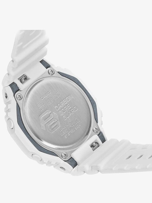 The GMA-S2100 series downsizes the GA-2100 watch to create a simple and slim design. It combines a 43mm octagonal shaped white resin case and strap with a traditional buckle. Its white 3D dual display dial has a simple to read digital display, Neobrite coated hands, and a day of the week sub-dial, all of which is protected beneath mineral crystal glass. Power is generated by the quartz movement. This model also has a water resistance of up to 200 metres.