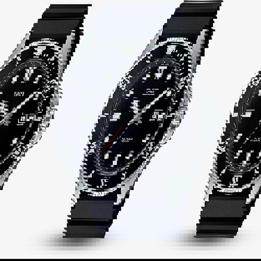 A robust and stylish timepiece, ideal for both diving enthusiasts and everyday wearers. It features a stainless steel case measuring 44. mm complemented by a durable black plastic strap ensuring comfortable wear. The watch boasts a black dial with luminous hands and markers, ensuring clear visibility even in low-light conditions. A date display is conveniently positioned at the 3 o'clock mark, while the unidirectional bezel allows for precise timekeeping, a useful feature for divers. With an impressive water resistance of up to 200 meters, this timepiece combines functionality with a sleek design, making it a dependable companion for your collection.