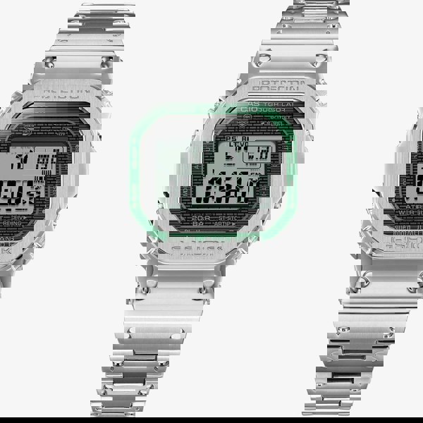 A premium timepiece that combines classic G-Shock toughness with modern style and advanced functionality. Housed in a durable, stainless steel body, this watch exudes a bold, metallic aesthetic reminiscent of the original G-Shock designs. It features a fully digital display with a backlight for enhanced visibility in low-light conditions. Built for durability, the watch is shock-resistant, water-resistant up to 200 meters, and equipped with a scratch-resistant mineral glass. Also included are advanced features such as Bluetooth connectivity, world time functionality, a stopwatch, a countdown timer, and daily alarms. With its elegant yet rugged look, this watch is perfect for those who seek a balance of timeless design, cutting-edge technology, and extreme durability.