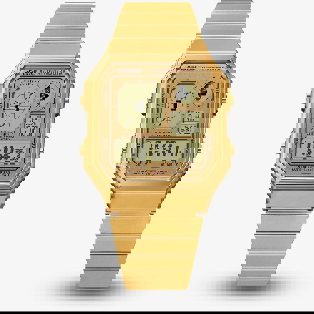 A stylish blend of retro charm and modern functionality. Featuring a striking gold-tone stainless steel case and bracelet, this timepiece exudes timeless elegance. Its digital display offers essential features such as a stopwatch, alarm, and LED backlight for easy readability. Lightweight and comfortable, this watch is perfect for everyday wear, adding a touch of vintage sophistication to any outfit. Whether you're a fan of classic Casio designs or looking for a statement accessory, this digital watch is a perfect choice.