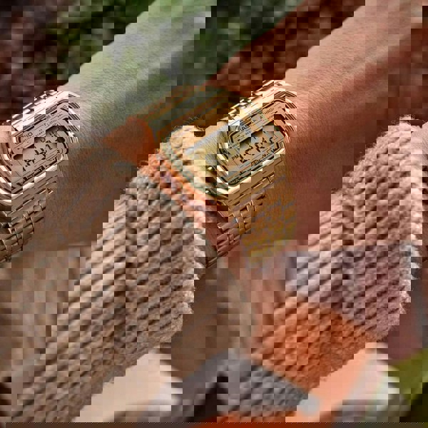 A stylish and functional timepiece that blends classic design with modern technology. This iconic watch features a classic square case with a gold-tone finish, giving it a vintage look that's perfect for any occasion. The digital display offers clear readability, displaying the time, date, and day of the week. Additional features include a stopwatch, alarm, and LED light for easy viewing in low-light conditions. The gold-tone stainless steel bracelet complements the watch's vintage aesthetic and provides a comfortable fit. This Casio watch is not only stylish but also durable, making it a reliable timepiece for everyday wear. Its water resistance of 30 meters protects it from splashes and rain, ensuring it can withstand the elements.