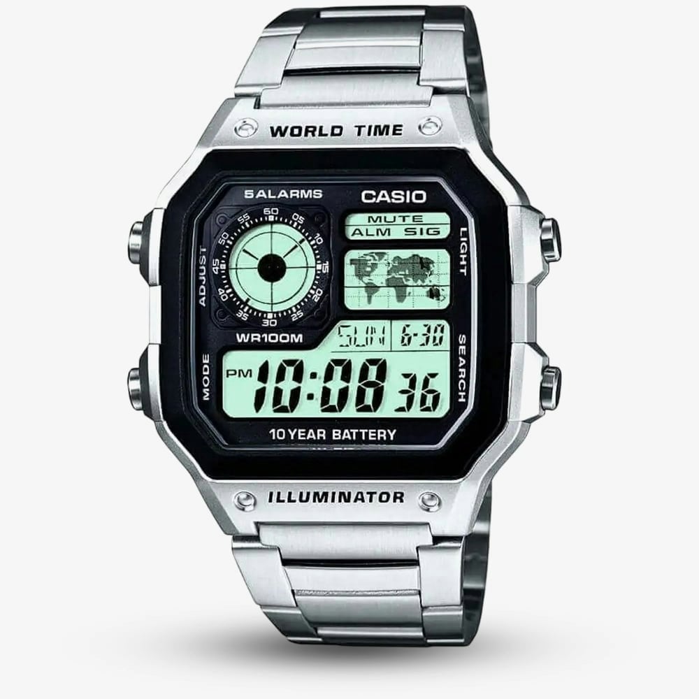 The Casio Classic Digital Watch combines functionality with durability. It features World Time, LED light, 1/100th sec stopwatch, countdown timer, and quick access to 4 time zones. With a 100M water resistance, a resin case, and a stainless steel band, it's a reliable and stylish choice for everyday wear.