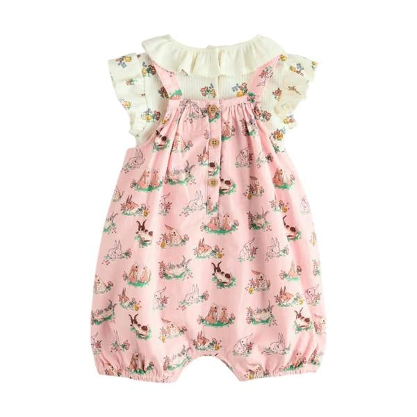 Cath Kidston brings a two-piece romper set for baby girls, finished in pink with playful prints. The jersey T-shirt has a floral pattern, paired with dungarees in a coordinating printed design. Frill detailing runs along the legs and straps, adding a decorative finish while keeping the look light and easy to wear.
